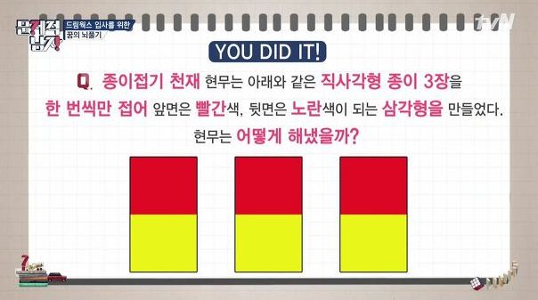 Hyun-moo made a triangle of red-colored front and yellow-colored back folding these three rectangles of papers only once. How did he make it?